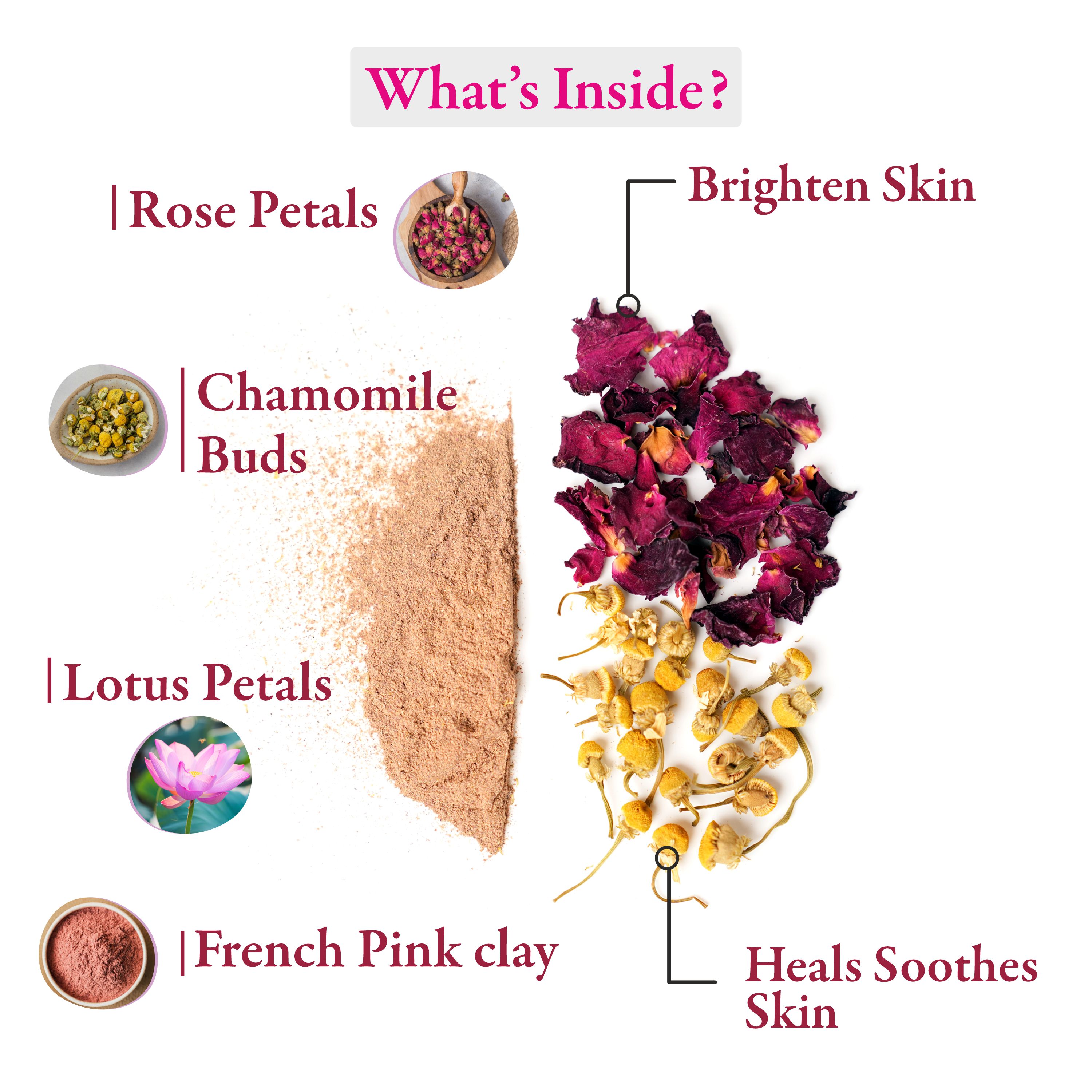 RED ROSE PETALS, CHAMOMILE BUDS, LOTUS PETALS, FRENCH PINK CLAY, HIBISCUS, TANNER CASSIA PETALS, ORANGE PEEL, OATS COLLAIDAL, BLUE PEA FLOWER.