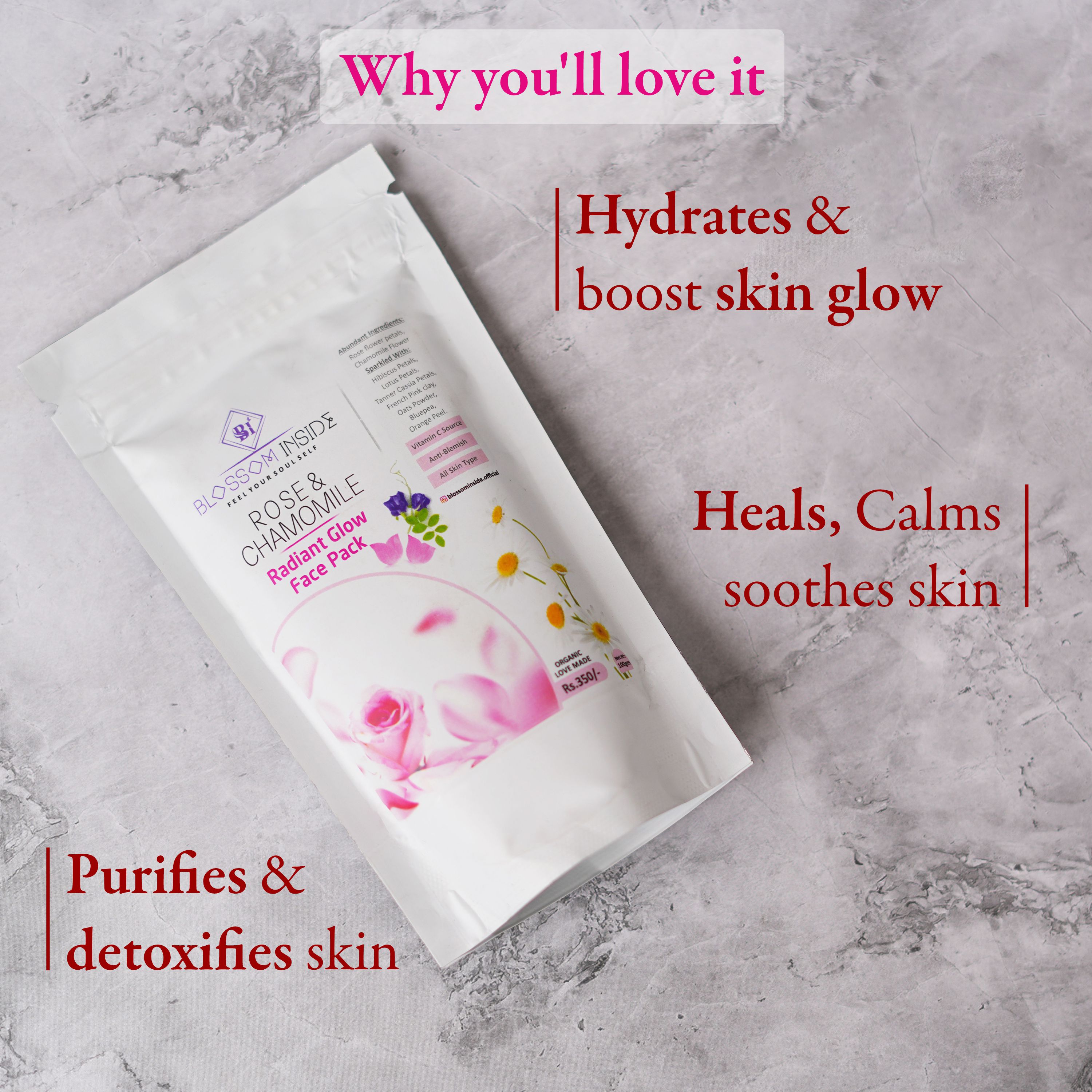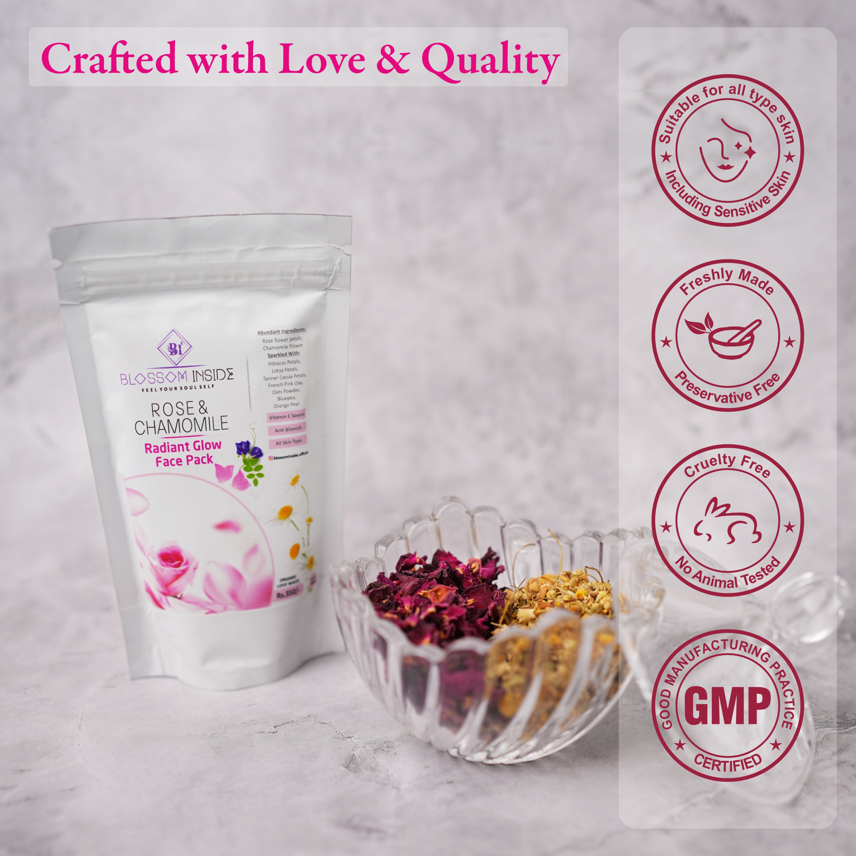 "RADIANT GLOW  FACE  PACK, carefully crafted for all skin types even Sensitive skin. Elegance of rose, the calming touch of chamomile,  and the purity of lotus. Unveil your skin glow & pamper yourself with the soothing harmony of botanical treasures."
